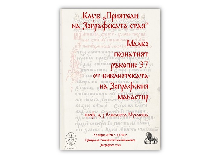 На 27 април 2026 г. от 17.30 ч. в Централната университетска библиотека ще се състои поредната сбирка на Клуб „Приятели на Зографската стая“. Проф. д-р Елисавета Мусакова ще представи „Малко познатият ръкопис 37 от библиотеката на Зографския манастир“.